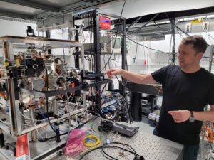 “In light interferometry, a beam of light is directed into a beam splitter, which divides the light into two separate paths. These two beams travel along their paths and are later combined again. When they recombine, their overlapping waves create an interference pattern, which can reveal extremely small changes in the paths they take. In quantum interferometry, we do something similar with atoms. We start with an atomic cloud and use lasers to manipulate and split the atoms into two different quantum states or trajectories. Then, we use additional lasers to recombine the states and analyze the resulting interference pattern on the atom to extract information.”