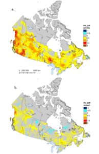 According to the map on the right, which is divided into sections (a) and (b), much of southern Canada has seen an increase in Canadian hardiness zone ratings compared to the 1961–1990 period. The most significant increases, reaching up to 2 full zones, are found in western Canada, especially in southern and northwestern British Columbia. The far northern regions of the country remained unchanged, as the hardiness index is not designed for the extremely cold conditions there, and therefore does not account for any warming that may have occurred.