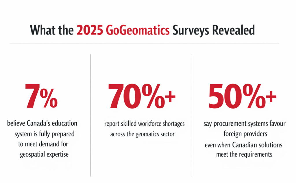 Previous surveys revealed several concerning trends. Only about 7 percent of respondents believed Canada’s education system was fully prepared to meet the growing demand for geospatial expertise, more than 70 percent reported skilled workforce shortages, and over half said procurement systems often favour foreign providers even when Canadian solutions meet the requirements.