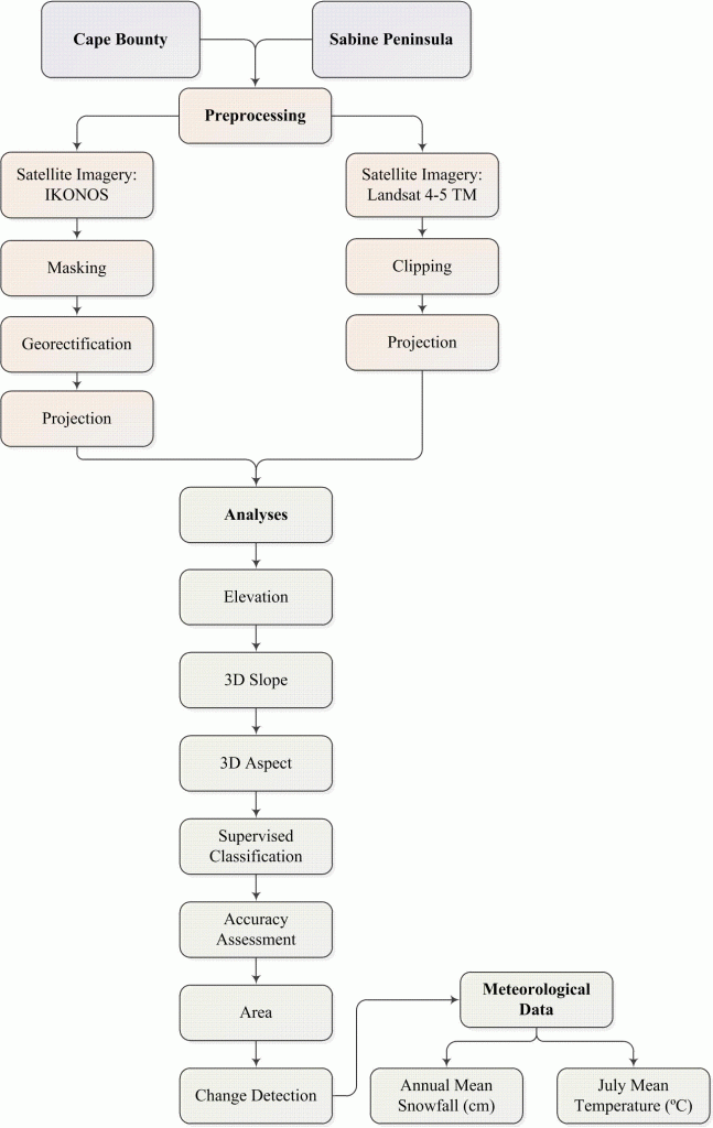 I had to conduct an extensive methodology approach to successfully determine potential changes to perennial snowpack and/or its surroundings. The following diagram illustrates the steps that were taken to complete any necessary preprocessing and the analyses on Cape Bounty and Sabine Peninsula. This required concentrated focus and attention to detail during analyses in order to produce the required accuracy in the results.