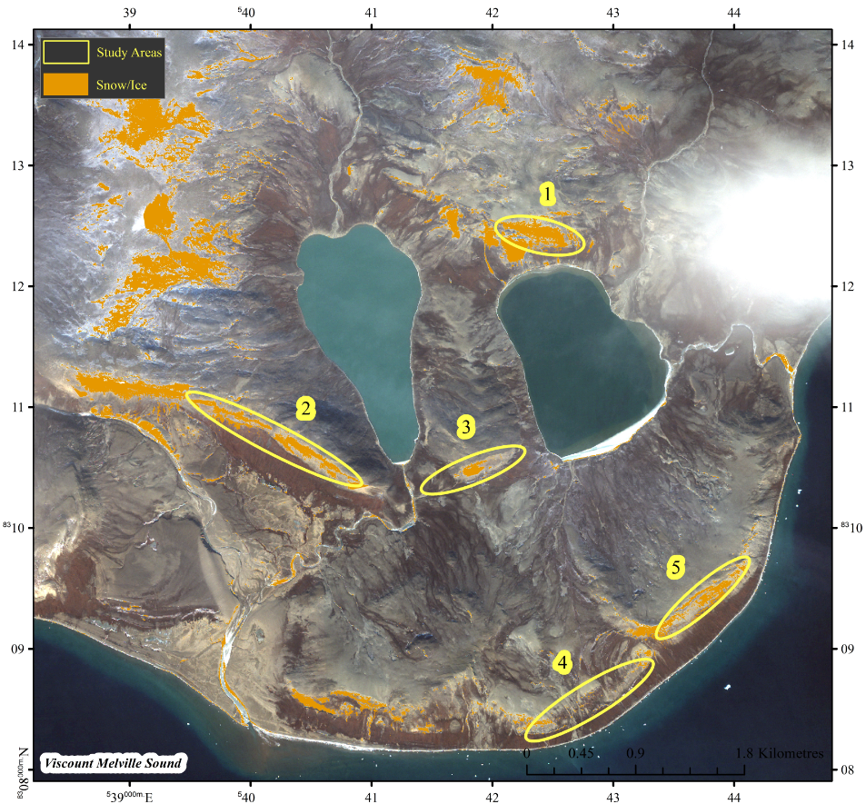 Stephanie: I continued to focus in the physical geography aspect where I successfully completed my Major Research Paper (MRP) titled “Identifying and Quantifying the Change of Perennial Snowpacks at Melville Island, Nunavut, Canada” with the help of my advisor, Professor David Atkinson. I collected a variety of data such as IKONOS and Landsat 4-5 TM satellite images, Digital Elevation Models (DEMs), topographic, and meteorological data.