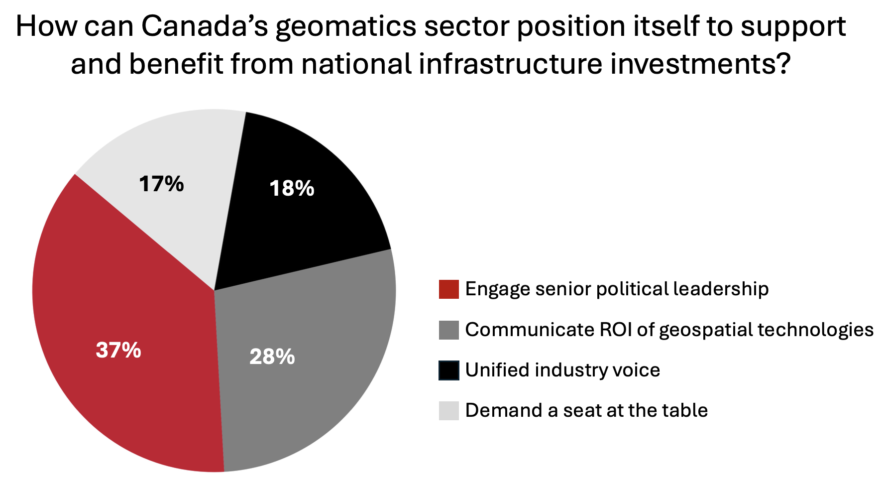 When asked how the geomatics sector can best position itself to benefit from Ottawa’s infrastructure investments, 37% of respondents said the community needs to engage senior political leadership more directly. Another 28% emphasized the importance of communicating the return on investment (ROI) of geospatial technologies, while 18% called for a more unified industry voice.