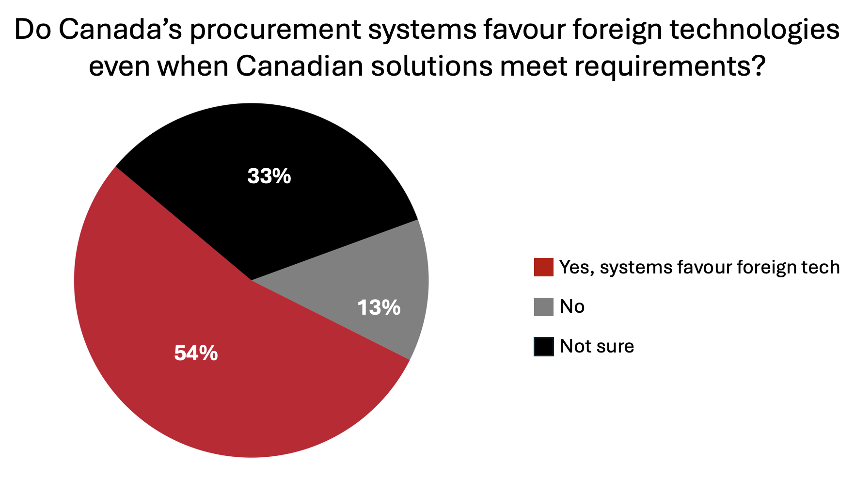 A majority of respondents believe Canadian innovation is being sidelined. More than 53% said the current procurement system favors foreign technologies even when Canadian alternatives meet or exceed requirements. Only 13% disagreed, while one-third were unsure.