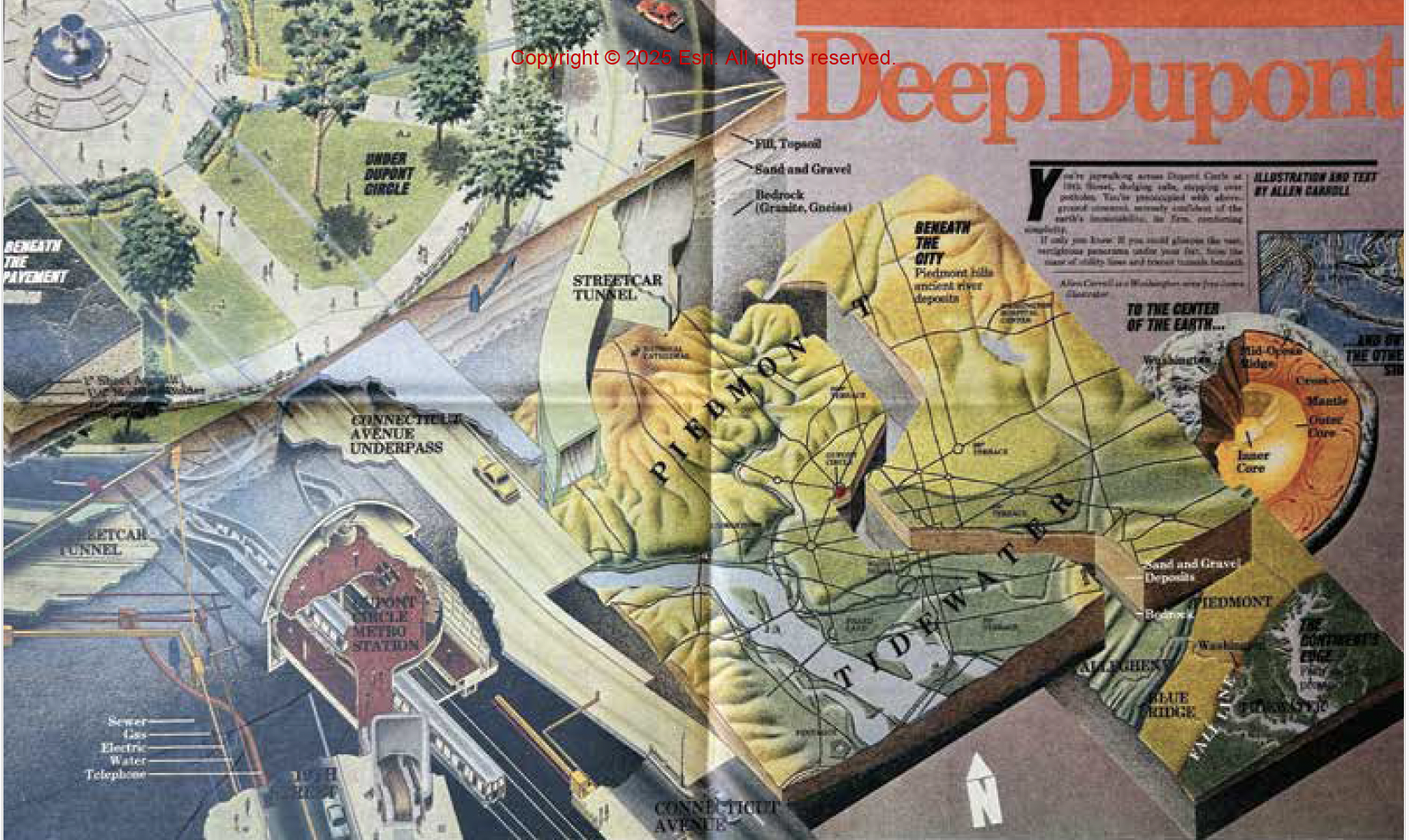 Once he pitched an idea to them: What lies beneath Dupont Circle (Introduction, xiii) that tangled roundabout in Washington, D.C.? The result was a six-panel vertical excavation, moving from the asphalt to the streetcar tunnels to the Metro system to the geologic provinces under the city — and finally, to the exact point on the Earth’s surface opposite D.C., somewhere in the Indian Ocean.