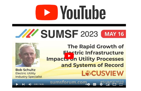 Robert (Bob) Schultz, an Electric Utility Industry Specialist for Locusview, held a livestream presentation at SUMSF 2023. The topic of his talk was “The Rapid Growth of Electric Infrastructure Impacts on Utility Processes and Systems of Record.”