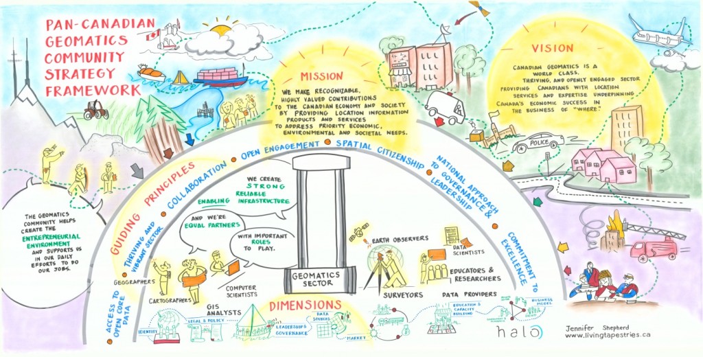 Our student group discussed the Pan-Canadian Geomatics Draft Strategy, which was developed by the Canadian Geomatics Community Round Table (CGCRT) in order to examine common issues and to present a coast-to-coast plan to reposition the sector for future success. As students we explored one dimension of the Strategy in particular – which focuses on ‘Education and Capacity Building’ and how that relates to students and new professionals at the college and university level. As well this dimension is particularly concerned with ensuring a geospatially-enabled society by making sure the broader geospatial community has the skills necessary to make effective use of geospatial information in their daily work.