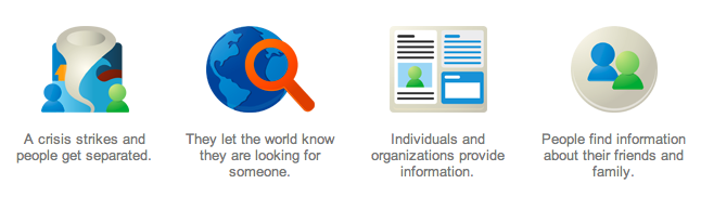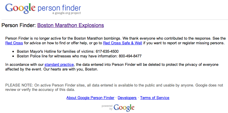 Another example is how the Google Person Finder was used again during the Boston Marathon bombings, allowing friends and family to access the database, whether you were looking for someone, or had information about someone. Missing person reports, information from emergency officials and data from site users was compiled to set up the searchable database, available less than one hour after the explosions in Boston. Below, you can view the active webpage that was available post-explosions.