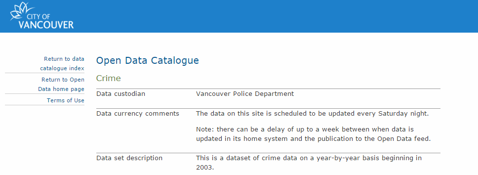 One such area is in the area of crime. As one example, the Vancouver Police Department (VPD) has just published the GeoDash website which displays locations of various crimes on a map.