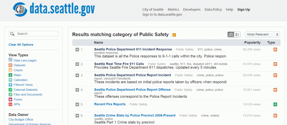 In the meantime, Vancouver’s neighbour to the south, Seattle, has a well-developed Open Data site with a Public Safety section. This section has incidents of both police and fire calls, sliced and diced by various views. The incidents have both date and time attributes.