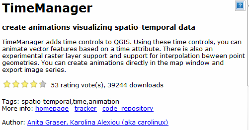 dimension of a feature is implemented in QGIS through the splendid TimeManager plugin. As with all QGIS plugins, this plugin installs directly in the QGIS Plugin Manager window. You don’t have to download and configure.